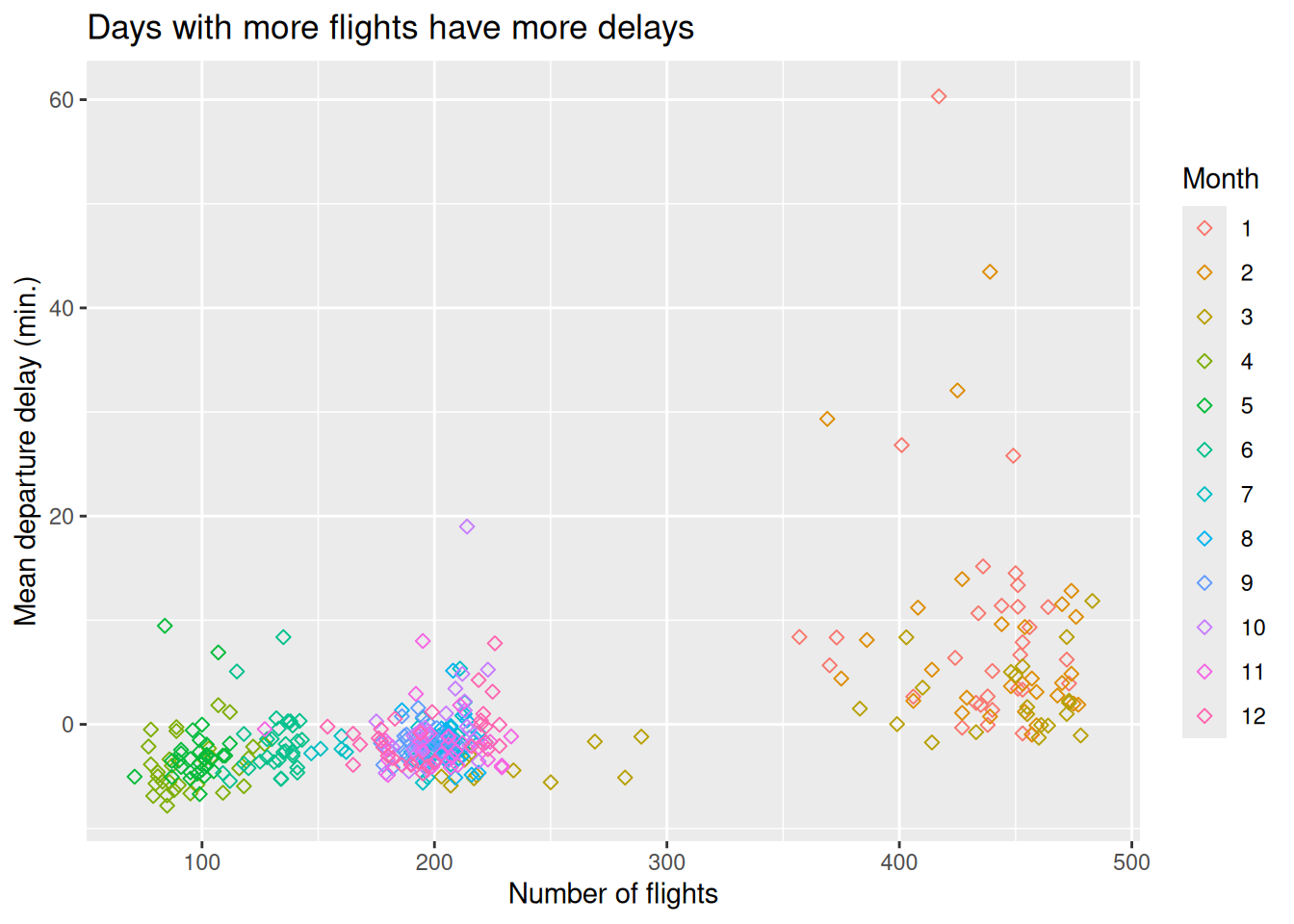 The plot below shows a relationship between the number of flights going out of SFO and the average departure delay. It illustrates the hypothesis that more flights on a given day would lead to a more congested airport which would lead to greater delays on average. Each point represents a single day in 2020; there are 366 of them on the plot.