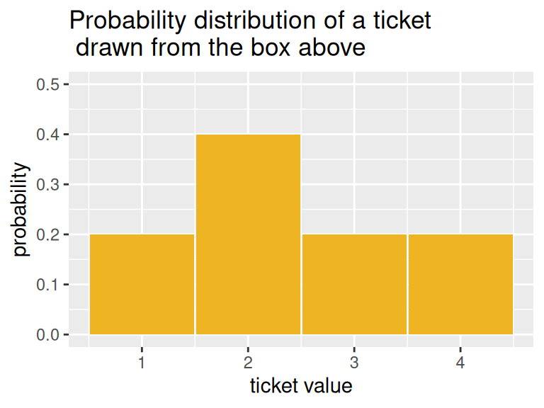 On the x-axis of this histogram, we have the ticket values; on the y-axis, we have the proportion of times that this ticket was selected out of the 50 with-replacement draws we took.We can see that the sample proportions looks similar to the values given by the probability distribution, but there are some differences. For example, we appear to have drawn more \(3\)s and less \(4\)s than what was to be expected. It turns out that the counts and proportions of the drawn tickets are:
